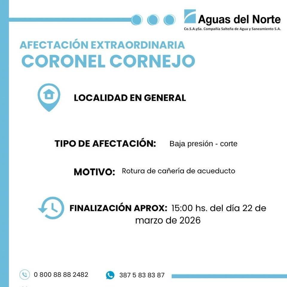 General Mosconi: La empresa Aguas del Norte informa sobre una afectación extraordinaria de agua potable en Coronel Cornejo.