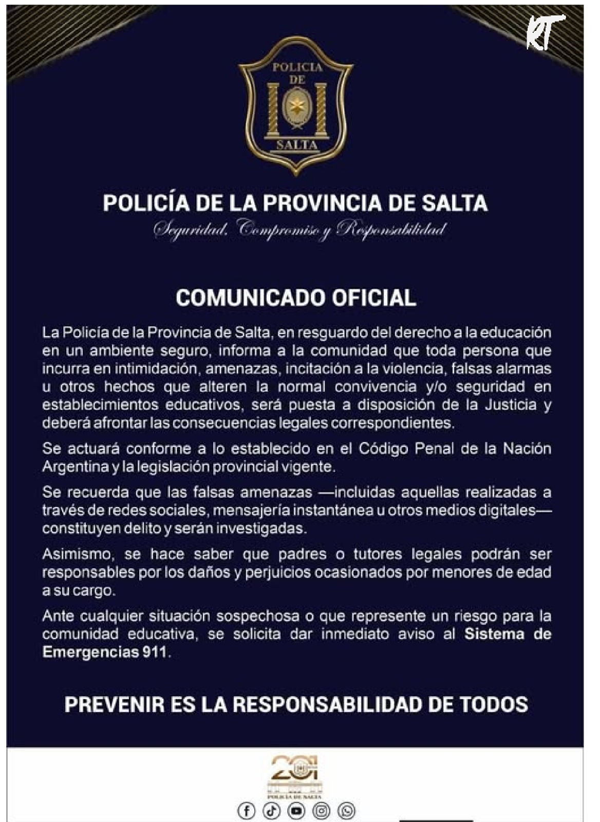 Comunicado de la Policía de la Provincia, luego de las amenazas escritas en los sanitarios de algunas escuelas.
