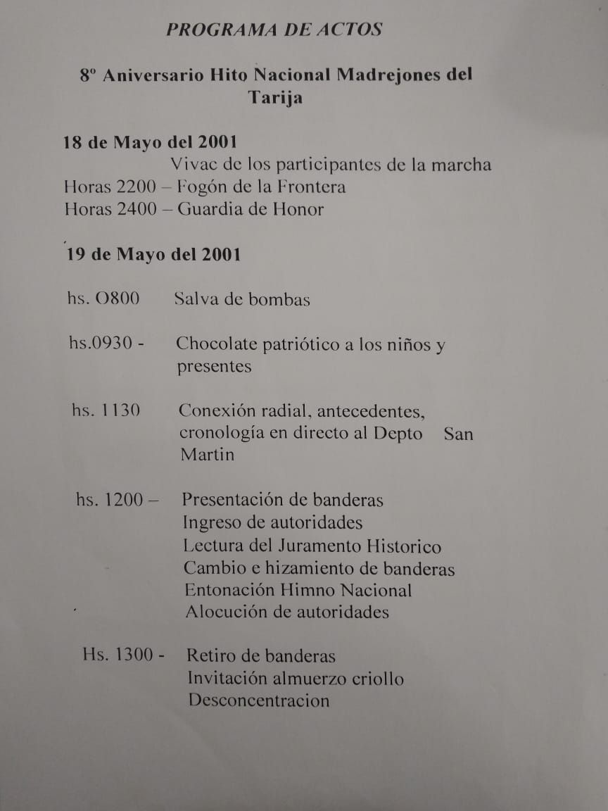 PROGRAMA DE ACTOS 8° ANIVERSARIO HITO NACIONAL MADREJONES DEL TARIJA