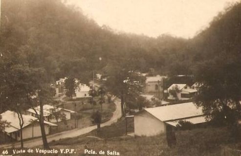 Al iniciarse las construcciones de dependencias de YPF, en la entonces mina República Argentina, el primer campamento recibió el nombre de Vespucio y la estación también. Al incrementarse las actividades de YPF, con oficinas centrales en Campamento Vespucio, el movimiento que generó incrementó el desarrollo del campamento. Así Campamento Vespucio había nacido con el nombre de Mina Argentina, impuesto por el pionero de la actividad petrolera zonal D. Francisco Tobar, cuando allí surgió por primera vez el oro negro.