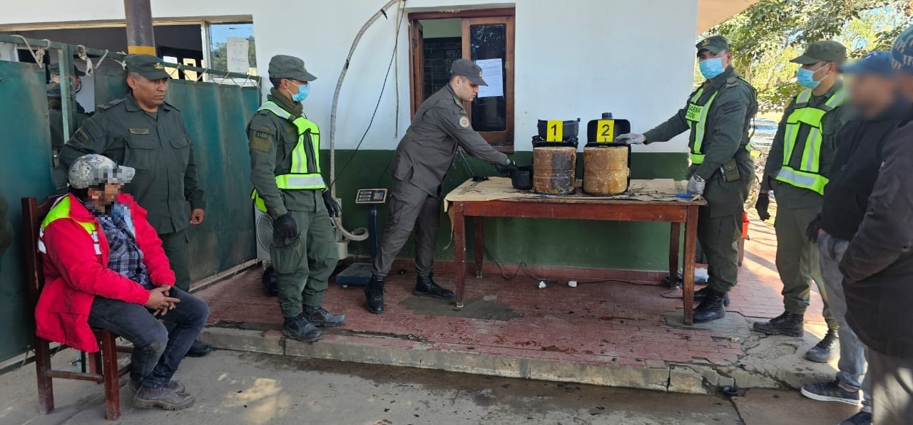 Ante la marcación activa del can y las altas posibilidades de estar frente a un hecho ilícito, en presencia de testigos, los gendarmes retiraron los dos recipientes plásticos y realizaron cortes para abrirlos.