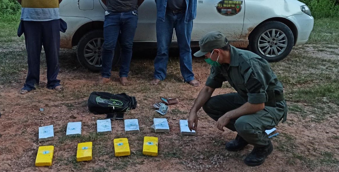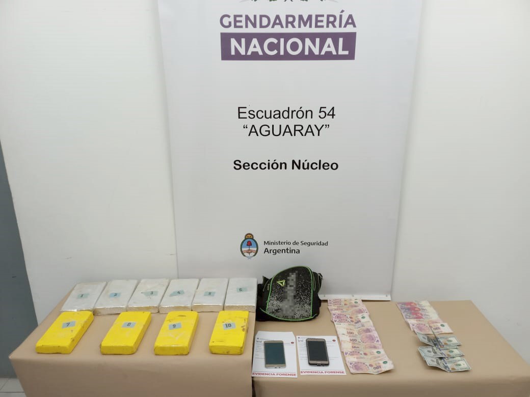 Al momento de la inspección, los funcionarios detectaron que uno de los ciudadanos ocultaba una mochila debajo del asiento. Dentro del mismo, los gendarmes hallaron 10 paquetes rectangulares con una sustancia pulverulenta en su interior.