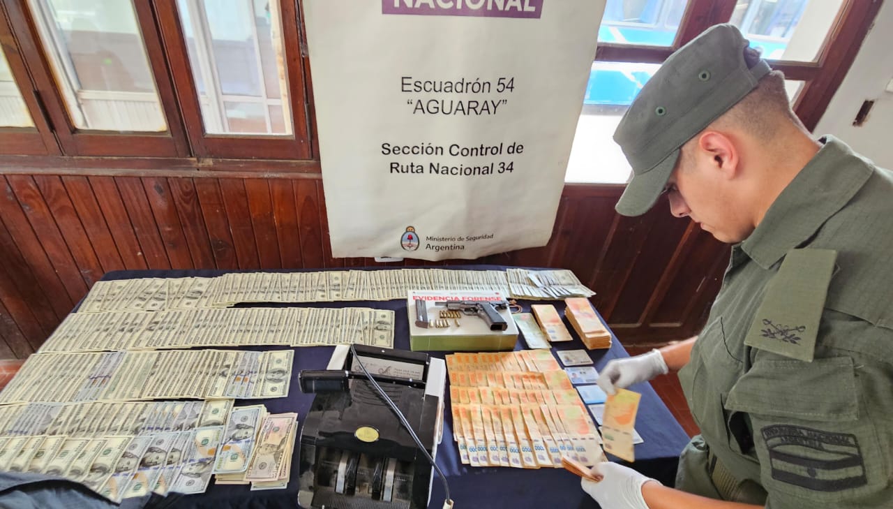 Al momento de la inspección, los funcionarios detectaron  una gran cantidad de billetes de distintas denominaciones y una pistola calibre 9 mm, el cual poseía la numeración limada y 12 municiones. Ante esa situación, los gendarmes contabilizaron un total de 33.750 dólares estadounidenses y 287.000 pesos.