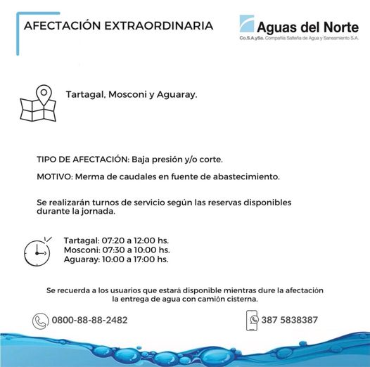 Aguas del Norte informa afectación extraordinaria para Mosconi, Tartagal y Aguaray.