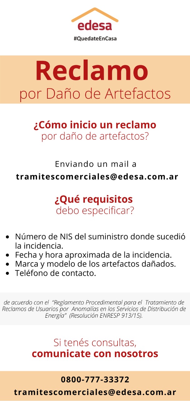 Aquellos usuarios que requieran iniciar una gestión comercial por artefactos dañados, podrán consultar los datos que deben enviar, y dónde deben enviarlos, ingresando aquí
