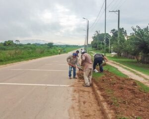 General Mosconi: Empleados municipales trabajan en la limpieza del cordón cuneta dela Avenida Urbana.