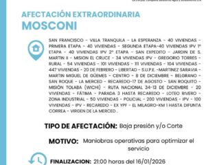 General Mosconi: Corte en el suministro de agua en varios barrios de la ciudad.