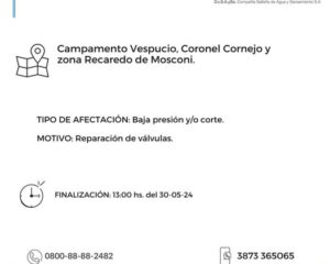 General Mosconi: Afectación extraordinaria de agua en la jurisdicción de Campamento Vespucio, Coronel Cornejo y Recaredo.