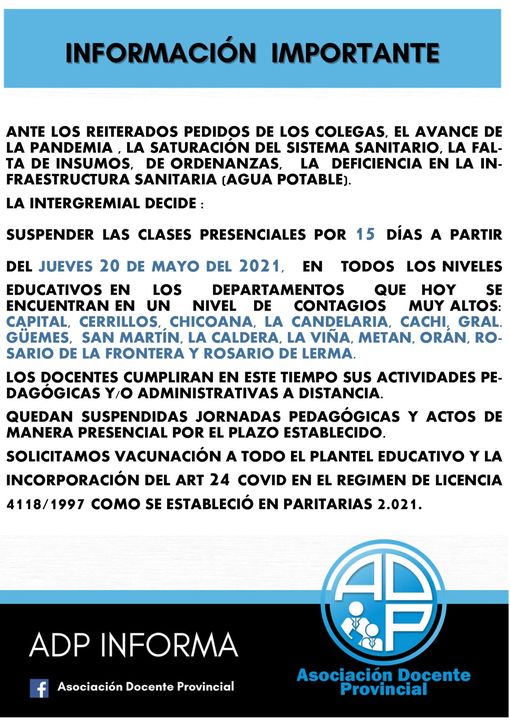 La Intergremial docente decidió suspender las clases presenciales por 15 días a partir del día jueves 20 de Mayo en todos los niveles educativos en: Capital, Cerrillos, Chicoana, La Candelaria, Cachi, General Güemes, San Martín, La Caldera, La Viña, Metán, Orán, Rosario de la Frontera y Rosario de Lerma. La medida obedece al alto nivel […]