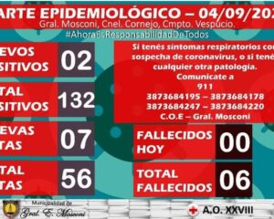 COVID-19: GENERAL MOSCONI REGISTRA 2 NUEVOS CASOS POSITIVOS Y ACUMULA 132