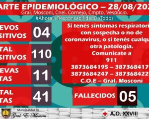 COVID-19: GENERAL MOSCONI REGISTRA 4 NUEVOS CASOS Y 1 NUEVO FALLECIMIENTO (CON RESULTADO POST MORTEM)