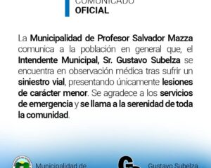 Salvador Mazza: Comunicado de prensa sobre el estado de salud del Intendente Subelza luego del siniestro vial.