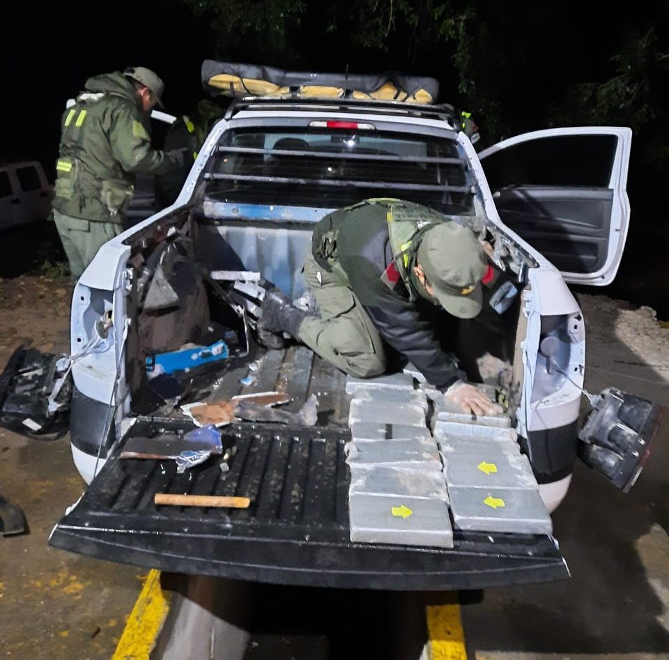 Al momento de efectuar la requisa sobre el rodado, los gendarmes observaron pintura fresca en la parte trasera, lo que motivó la extracción del cobertor plástico. Allí personal de la Fuerza visualizó anomalías en las paredes laterales y en el frente de la caja, por lo que se procedió al desarme de los laterales, frente e interior de cabina.