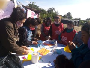 Durante la jornada de hoy la Supervisora General Institucional del Centro de Orientacion Familiar (COF) del municipio, Licenciada Griselda Palomino realizó actividades en la Comunidad Chiripa, ubicada en la entrada de los Mircos. Acompañaron la iniciativa de la confección de barbijos, las señoras que componen la «Agrupación Darío Santillán».