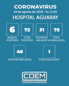 El Comité Operativo de Emergencia (COE) de la ciudad de Aguaray, informó que en la jornada de hoy registra seis (6) nuevos casos POSITIVOS de COVID-19.