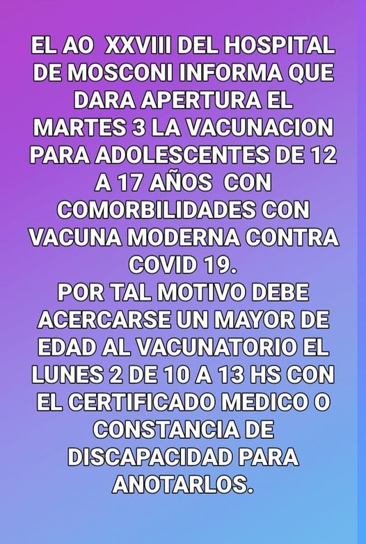 Desde el ÁREA Operativa XXVIII, informan que el próximo martes 3 de Agosto se dará apertura a la vacunación para adolescentes en nuestra jurisdicción.