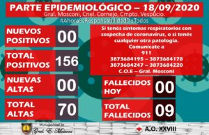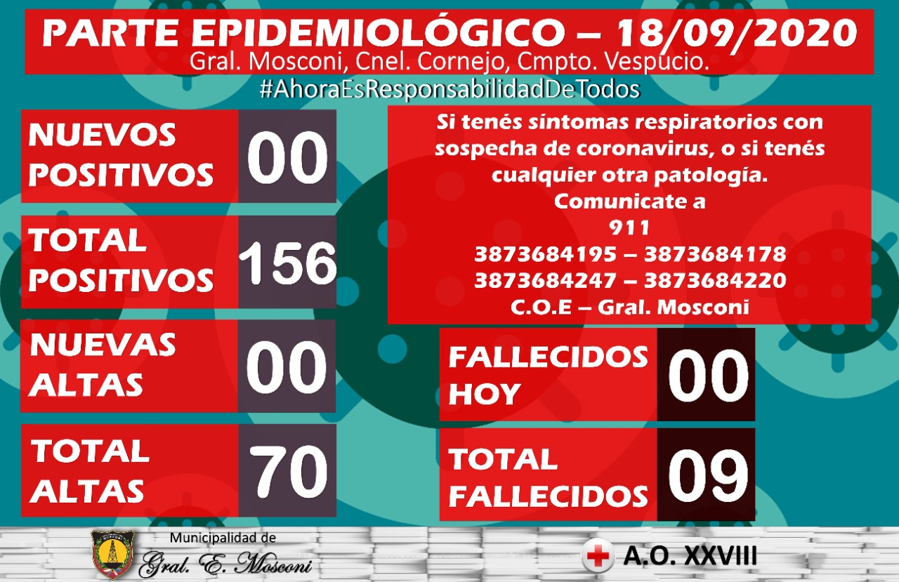 El Comité Operativo de Emergencia (COE) de nuestra ciudad informa que según el Sistema Integrado de Información Sanitaria Argentino (SISA), en la jornada de hoy no se registraron casos positivos de COVID-19, por lo que el acumulado hasta el momento desde el primer positivo es de 156.