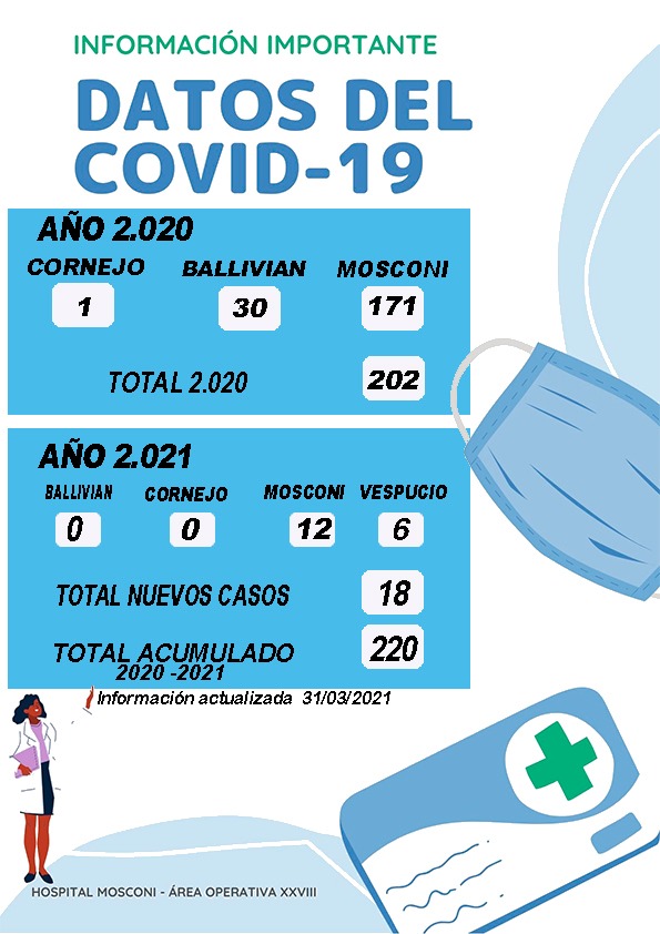 Actualmente el Municipio de General Mosconi tiene 18 casos POSITIVOS aislados durante el año en curso.  220 casos en sumatoria desde que se registró el 1° Caso POSITIVO.