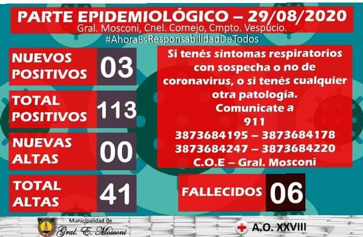COVID-19: GENERAL MOSCONI REGISTRA 3 NUEVOS CASOS POSITIVOS Y 1 NUEVO FALLECIMIENTO CON RESULTADO DE HISOPADO POST MORTEM.