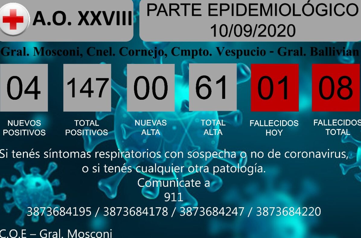 Para este parte se informa 1 nuevo fallecimiento, se trata de un paciente con hisopado positivo para COVID-19 que se encontraba internado en la ciudad de Tartagal.