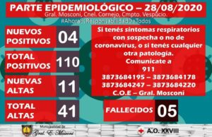 El Comité Operativo de Emergencia (COE) de nuestra ciudad informó que se registraron cuatro (4) nuevos casos Positivos de COVID-19, y acumula 110 casos. Se trata de pacientes particulares que realizaron los testeos en Laboratorios Privados.