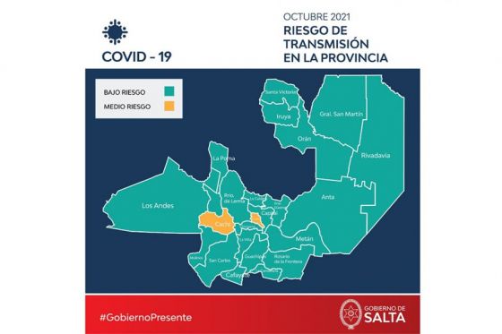 A la fecha, no hay zonas de alto riesgo epidemiológico. 21 departamentos están considerados de bajo riesgo de transmisión de COVID-19, lo que representa el 91% de la división política de Salta; mientras que 2, son clasificados de mediano riesgo.