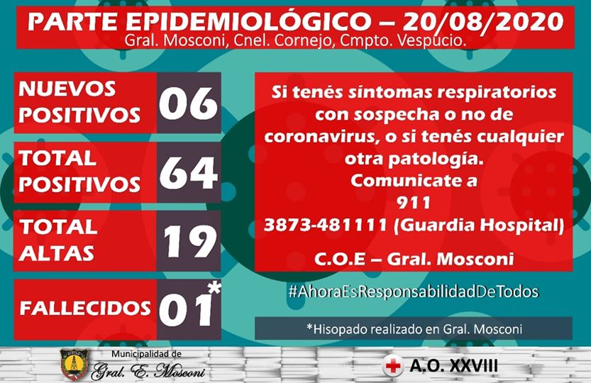 Desde Vigilancia Epidemiológica del Hospital de nuestra ciudad, el Comité Operarivo de Emergencia (COE) Mosconi, informa que nuestra ciudad registra seis (6) nuevos casos positivos.