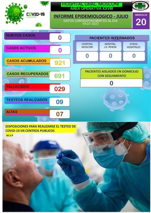 Según el informe epidemiológico correspondiente al día 19 de julio, no se registraron nuevos casos de Covid-19 en nuestra jurisdicción.