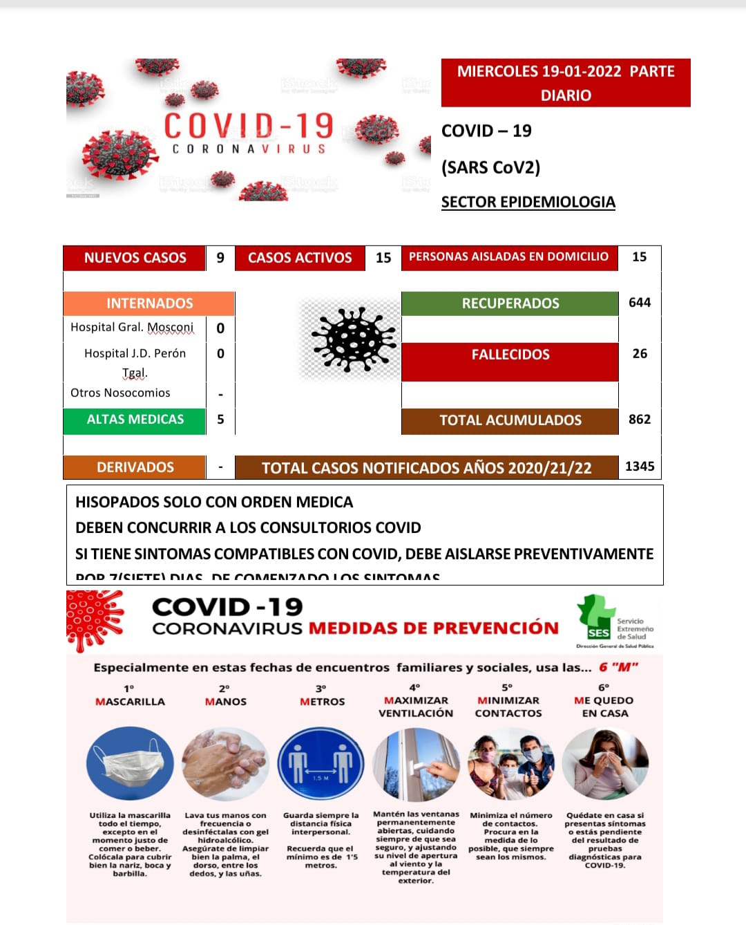 Nuestra jurisdicción registra en la jornada de hoy 9 nuevos casos positivos de Covid-19. constituyendo de esta manera 15 casos activos, de los cuales totalizan 15 personas aisladas en sus respectivos domicilios.