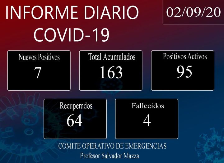 47 resultados de hisopados realizados días atrás, de los cuales se registran 7 NUEVOS POSITIVOS determinando la suma de 163 POSITIVOS ACUMULADOS desde la fecha en que se declaró el 1er caso de COVID-19.