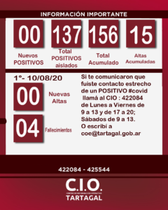 El Hospital Juan Domingo Perón informó 1 nuevo fallecimiento de un paciente Covid POSITIVO. #Tartagal tiene #Hoy 137 casos POSITIVOS aislados, 15 altas acumuladas, 156 casos en sumatoria desde el 1° Caso POSITIVO y 4 fallecimientos con covid 19.