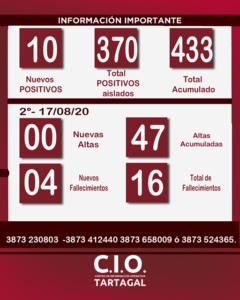 #Tartagal tiene 370 casos POSITIVOS aislados (se restan los 4 fallecimientos), 47 altas acumuladas, 433 casos en sumatoria desde el 1° Caso POSITIVO y 16 fallecimientos con covid 19.