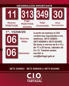 #Tartagal tiene 313 casos POSITIVOS aislados, 30 altas acumuladas, 349 casos en sumatoria desde el 1° Caso POSITIVO y 6 fallecimientos con covid 19.