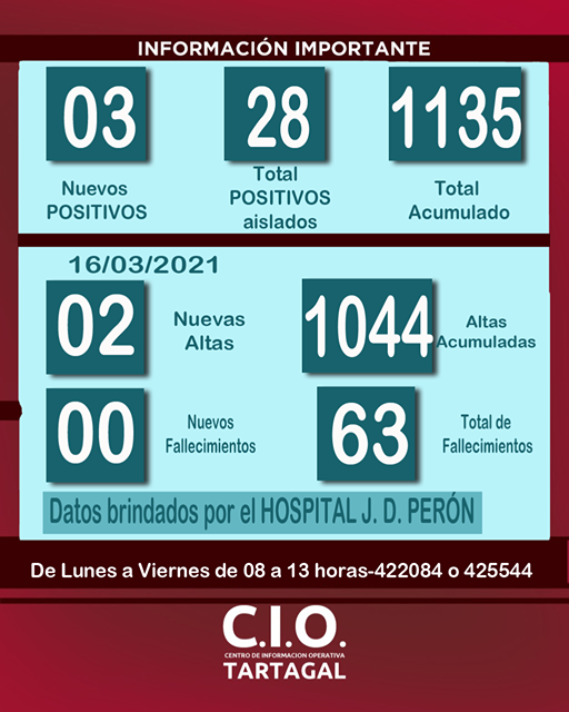 Por lo tanto, #Tartagal tiene 28 casos POSITIVOS aislados, (se le restan 2 altas) 1044 altas acumuladas, 1135 casos en sumatoria desde el 1° Caso POSITIVO y 63 fallecimientos por covid 19.
