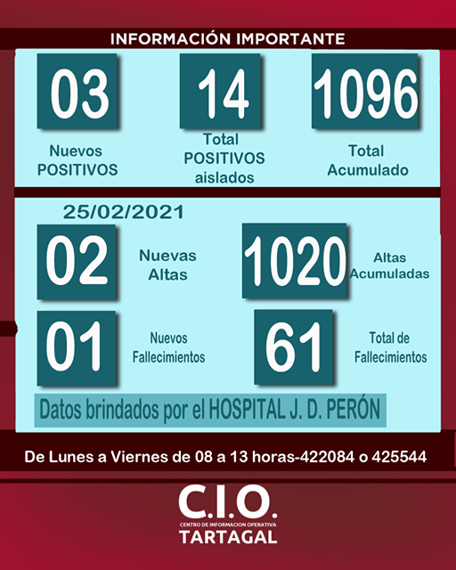 El Hospital Juan Domingo Perón informó que se registraron 03 Nuevos POSITIVOS para el parte del día, 01 fallecimiento y se realizaron 02 altas médicas de pacientes covid.