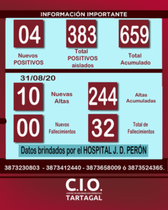#Tartagal tiene 383 casos POSITIVOS aislados (se le restan 10 altas), 244 altas acumuladas, 659 casos en sumatoria desde el 1° Caso POSITIVO y 32 fallecimientos con covid 19.