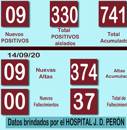 El Hospital Juan Domingo Perón informó 9 Nuevos POSITIVOS, 1 por criterio epidemiológico, y 9 altas médicas para pacientes covid 19; para este parte diario