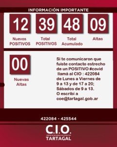 El Hospital Juan Domingo Perón informó 12 (doce) POSITIVOS para #covid 19. #Tartagal tiene 39 casos POSITIVOS aislados, 9 altas acumuladas y 48 casos en sumatoria desde el 1° Caso POSITIVO.