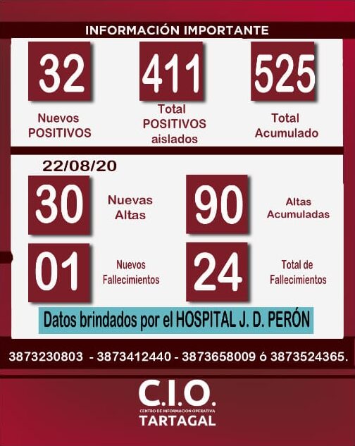 Tartagal tiene 411 casos POSITIVOS (se le restan 30 altas y 1 fallecimiento), 90 altas acumuladas, 525 casos en sumatoria desde el 1° caso positivo y 24 fallecimientos con COVID-19.