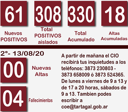 El Hospital Juan Domingo Perón informó 61 nuevos POSITIVOS para coronavirus para este segundo parte diario. 27 casos pertenecientes a Salud Pública y 34 del sector privado. #Tartagal tiene 308 casos POSITIVOS aislados, 18 altas acumuladas, 330 casos en sumatoria desde el 1° Caso POSITIVO y 4 fallecimientos con covid 19.