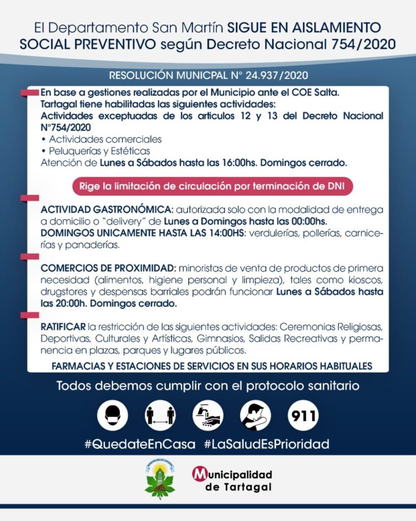 El Intendente Mario Mimessi, anunció que TARTAGAL, continuará con las mismas actividades habilitadas como hasta hoy.
