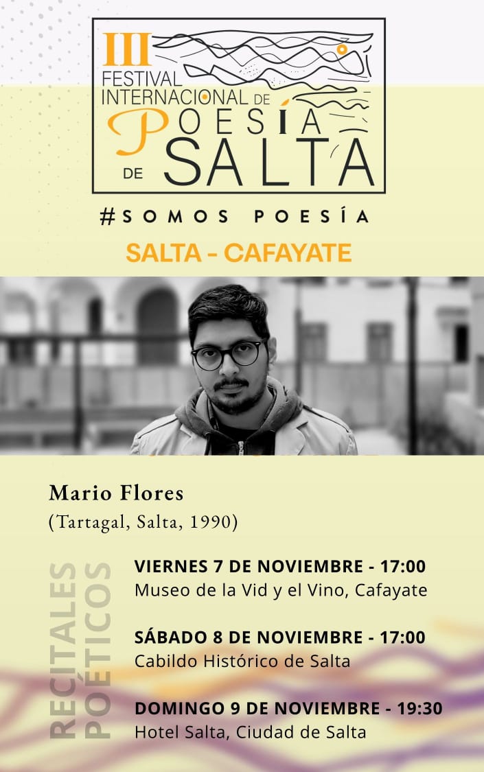 El III Festival Internacional de Poesía de Salta, que se llevará a cabo del 5 al 9 de noviembre entre Ciudad de Salta y Cafayate, organizado por la Asociación Festival Internacional de Poesía Salta con el acompañamiento de la Secretaría de Cultura. El III Festival Internacional de Poesía de Salta reunirá a 28 poetas de siete países y diez provincias. Entre los seis representantes de la provincia de Salta, se presenta por primera vez la participación de un poeta que no es de la capital salteña: el escritor Mario Flores, de la ciudad de Tartagal.