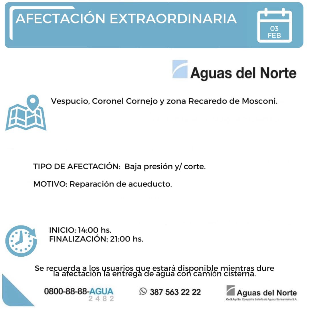 GENERAL MOSCONI: AFECTACIÓN DEL SERVICIO DE AGUA EN CAMPAMENTO VESPUCIO Y CORONEL CORNEJO POR CAMBIO DE CAÑERIAS.