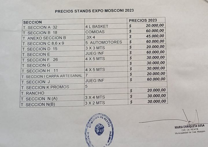 Desde la Dirección de Rentas, su titular Señora Enriqueta Sosa, informa que el próximo lunes 12 de junio comenzará la venta de los stand para la Expo Mosconi 2023.