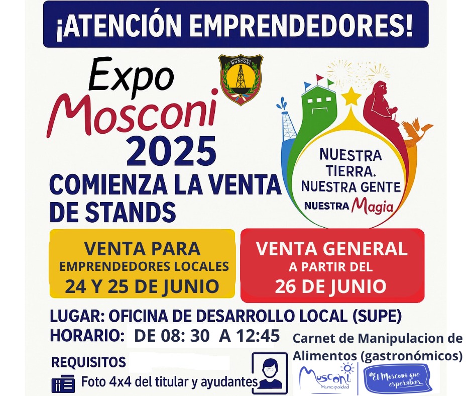 Desde la Dirección de Desarrollo Local de nuestro Municipio, informan a la comunidad que en el día de hoy Martes 24 de Junio, comienza la venta de los Stands para la Expo Mosconi 2025 a Emprendedores y PyMEs de nuestra ciudad.