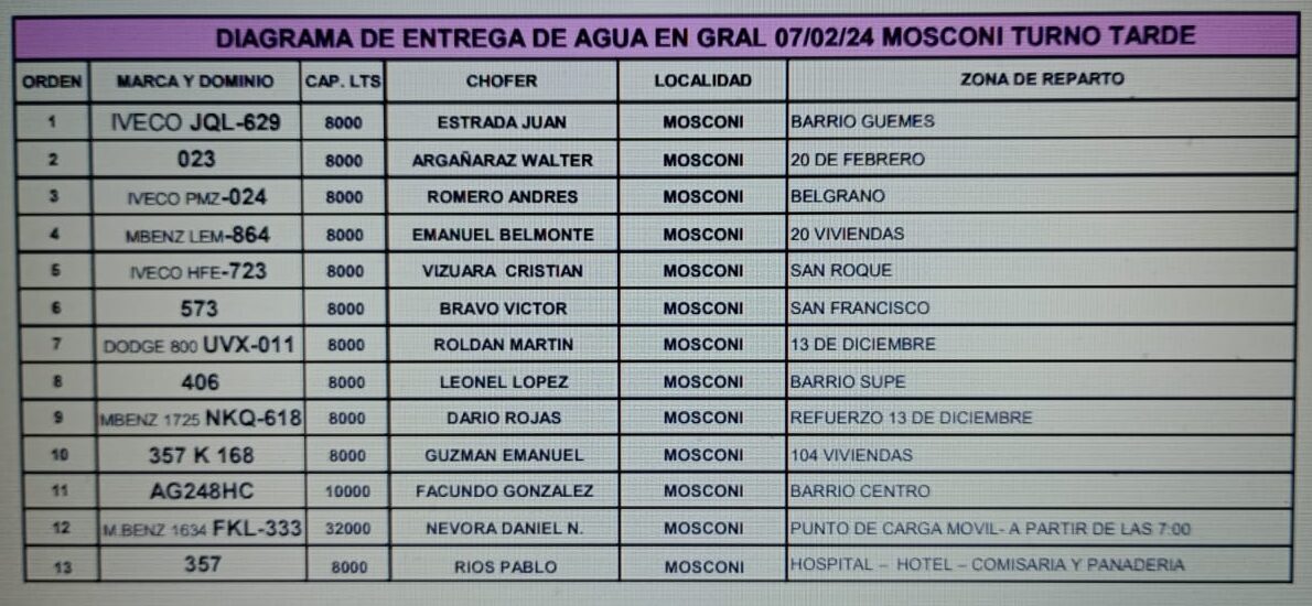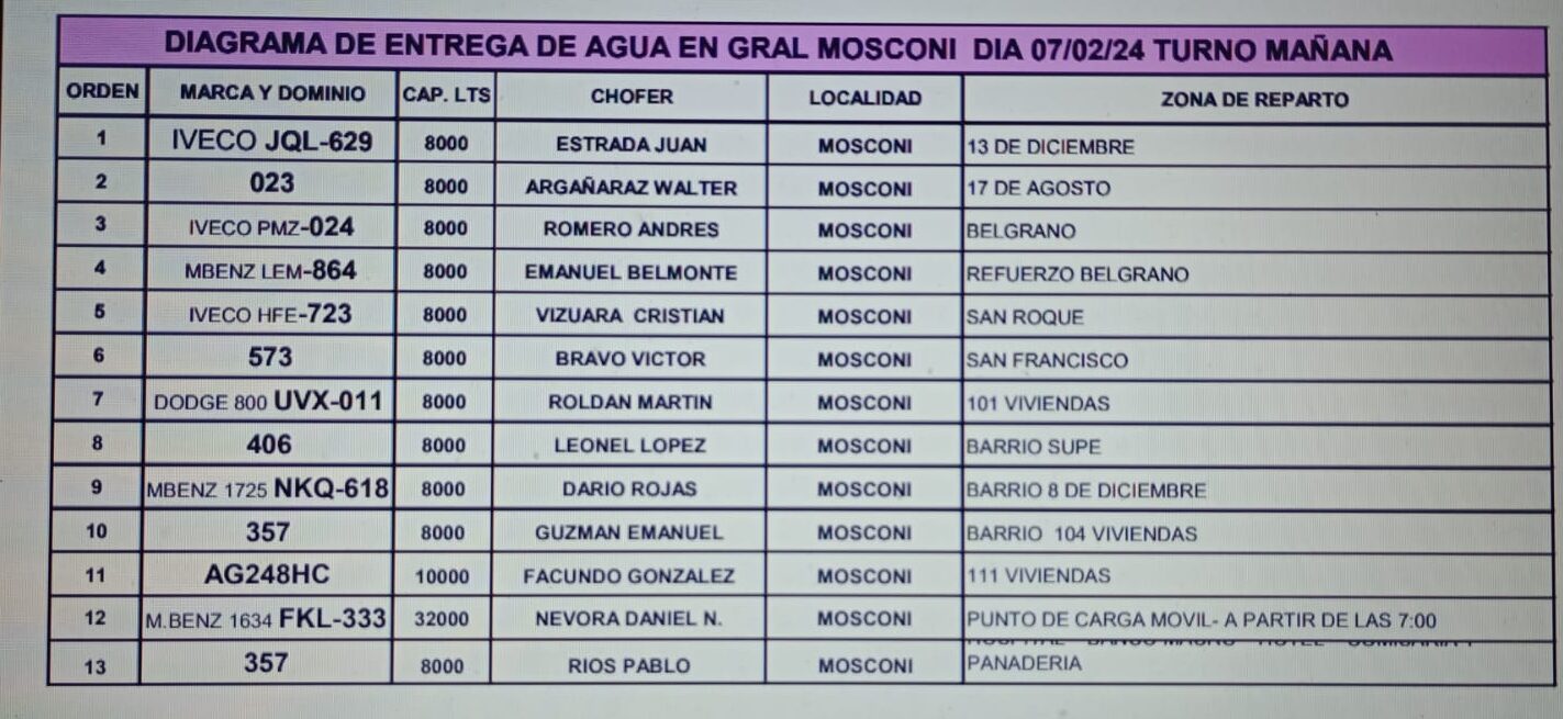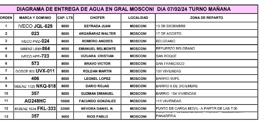 General Mosconi: Diagrama de distribución de agua -Día 07/02/2024
