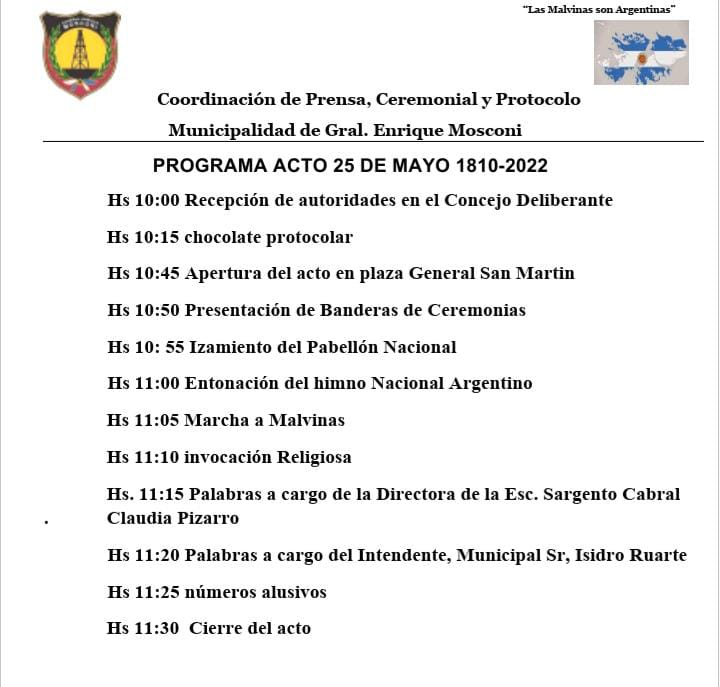 La Coordinación de Prensa , Ceremonial y Protocolo del Municipio, informó que el mismo dará inicio a las diez de la mañana con la recepción de autoridades en el Concejo Deliberante y el tradicional chocolate del 25 de Mayo en el lugar.