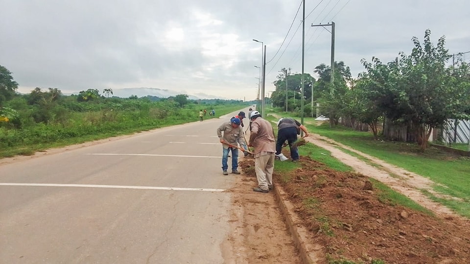 General Mosconi: Empleados municipales trabajan en la limpieza del cordón cuneta dela Avenida Urbana.