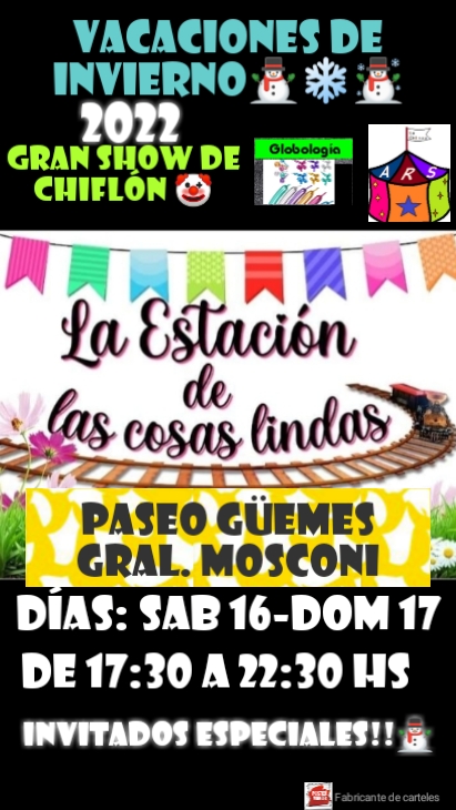 El sábado 16 y domingo 17 de Julio se presentará «El Gran Show de Chiflón» , con la alegría de siempre para arrancarle una sonrisa a las vacaciones de invierno. Será en el horario de 17:30 a 22:30 horas.