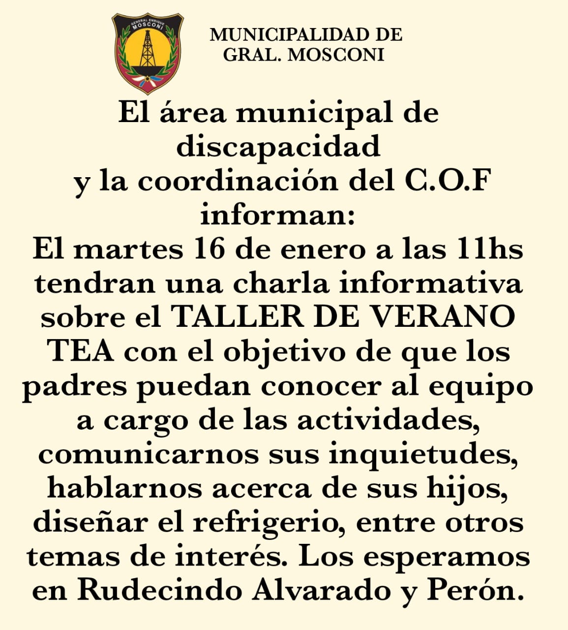 Desde el área municipal de Discapacidad y la Coordinación del C.O.F, se informa que el próximo martes 16 de enero a horas 11:00, brindarán una charla informativa destinada a padres con el objetivo de conocer al equipo que trabaja en la institución y abordar las inquietudes de los hijos.